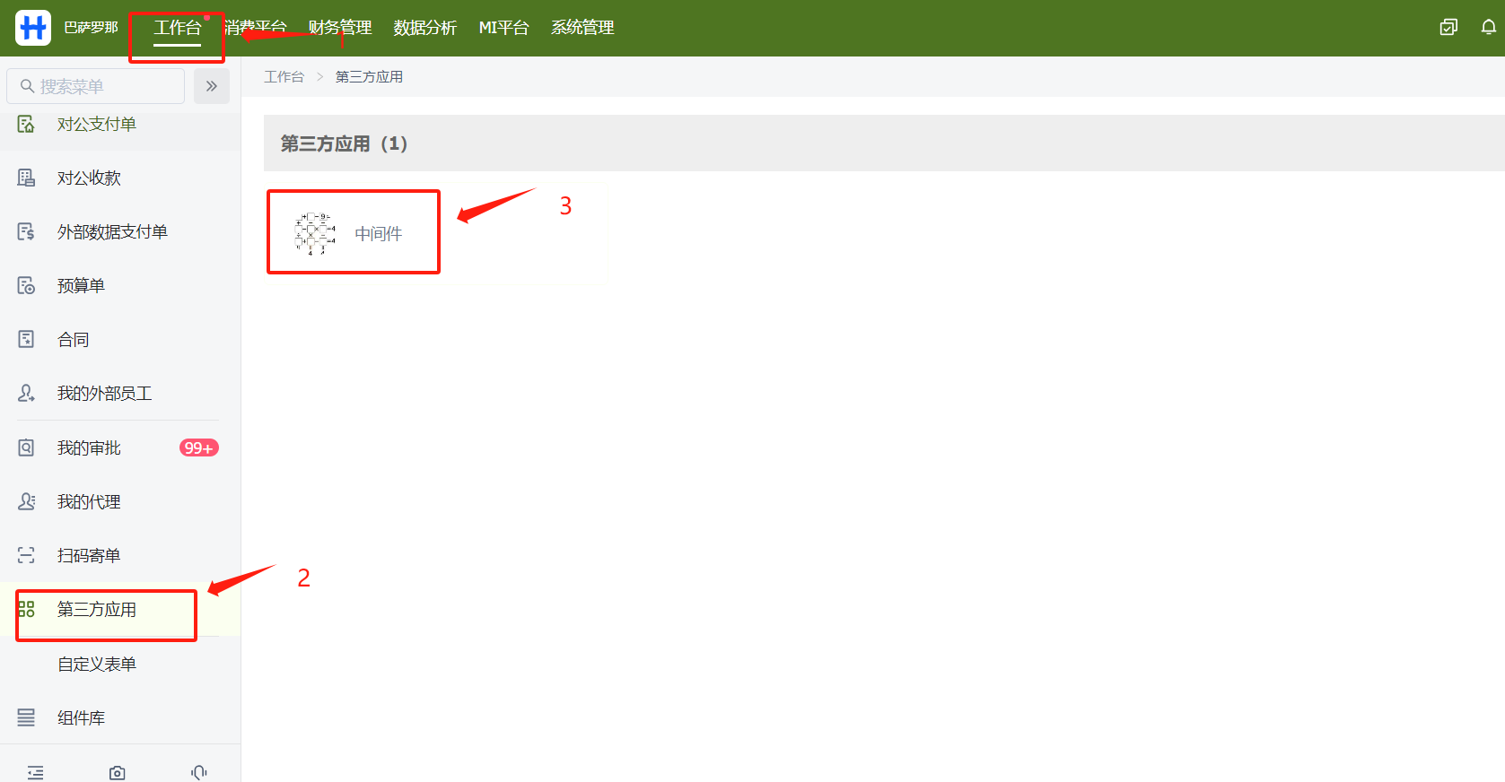 1.1.2. 在中控[工作台-第三方应用]中点击上一步添加的应用,即可进行跳转到中间件管理页面,如下图